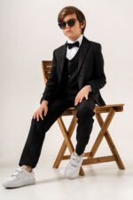The set includes a tailored blazer, double-breasted vest, classic white shirt, matching trousers, and a bow tie for a complete sophisticated look. Crafted from premium-quality fabric, it ensures comfort, durability, and a sharp modern silhouette.